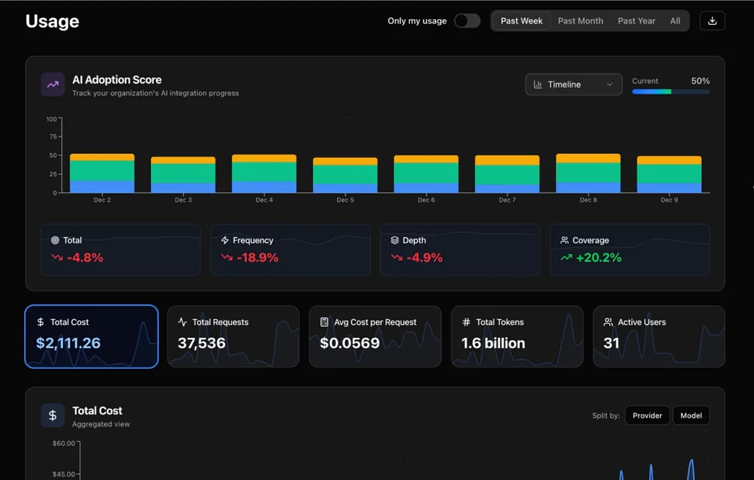 Complete visibility into team usage. Track spending, monitor model usage, and identify power users - all from a single dashboard designed for technical leaders.
